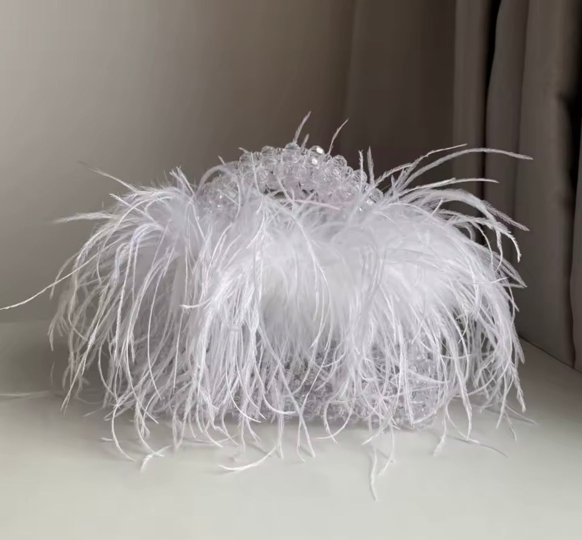Dazzle in divine elegance with The Halo Feather Clutch, a handcrafted designer handbag that radiates pure luxury. Adorned with shimmering clear acrylic crystal beads and wrapped in a cloud of soft feather fur, this piece captures the perfect balance of playfulness and sophistication — made for the woman who loves to stand out in style.