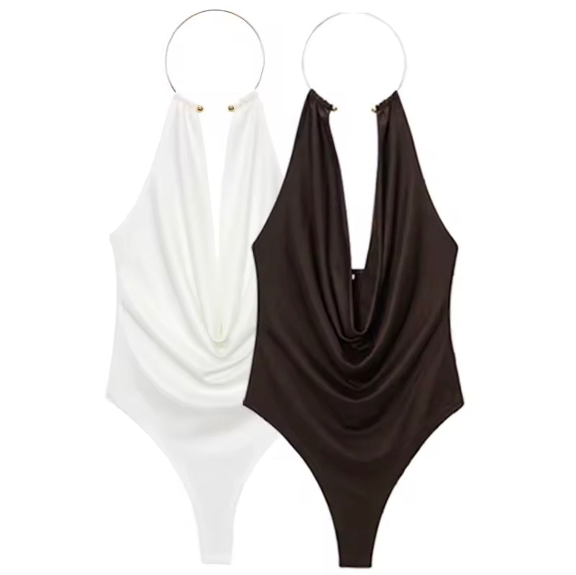 The Noémie Halter Bodysuit is designed with a fluid draped neckline and a sculptural halter silhouette, finished with a refined metal collar detail that frames the décolletage with effortless sophistication.